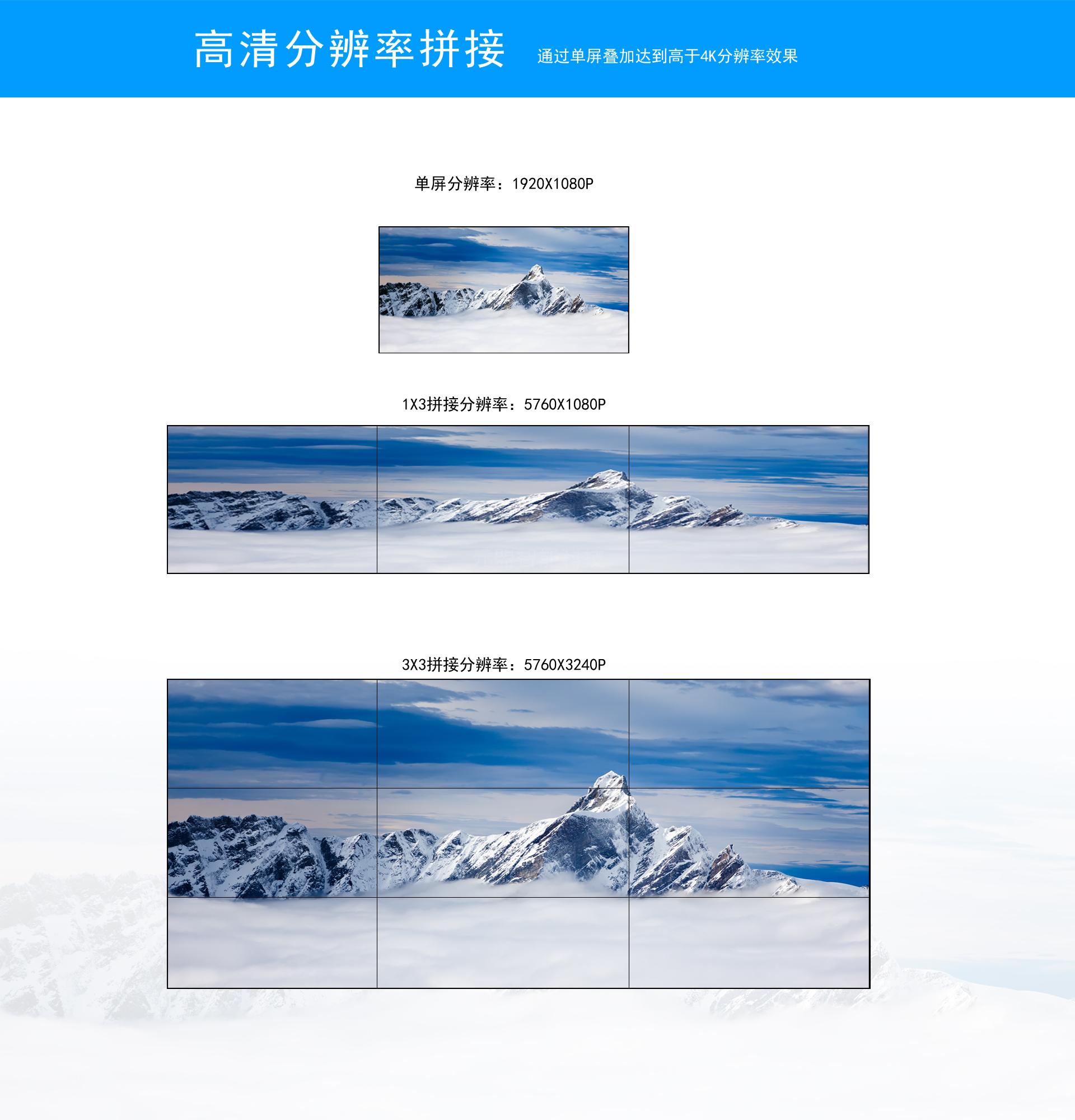 超窄邊液晶拼接單元采用三星面板,背光色彩還原度好,圖像逼真,點狀超密集分布,背光亮度均勻。采用高裕量的電子元器件,獨有智能色彩校正技術(shù),令色彩更加亮麗自然。采用UV2A液晶晶體排布技術(shù):亮場明亮、節(jié)能、超高光能效、暗場無漏光.超高對比度6ms響應速度,圖像更流暢。具有節(jié)能、無輻射,壽命長,長期使用亮度均勻,背光采用無玻璃材料、安全運輸、面板外殼裝材料堅固,不易破損。液晶顯示單元采用背光技術(shù),極大提升了拼接單元的整體顯示效果,具有突出的技術(shù)特點。